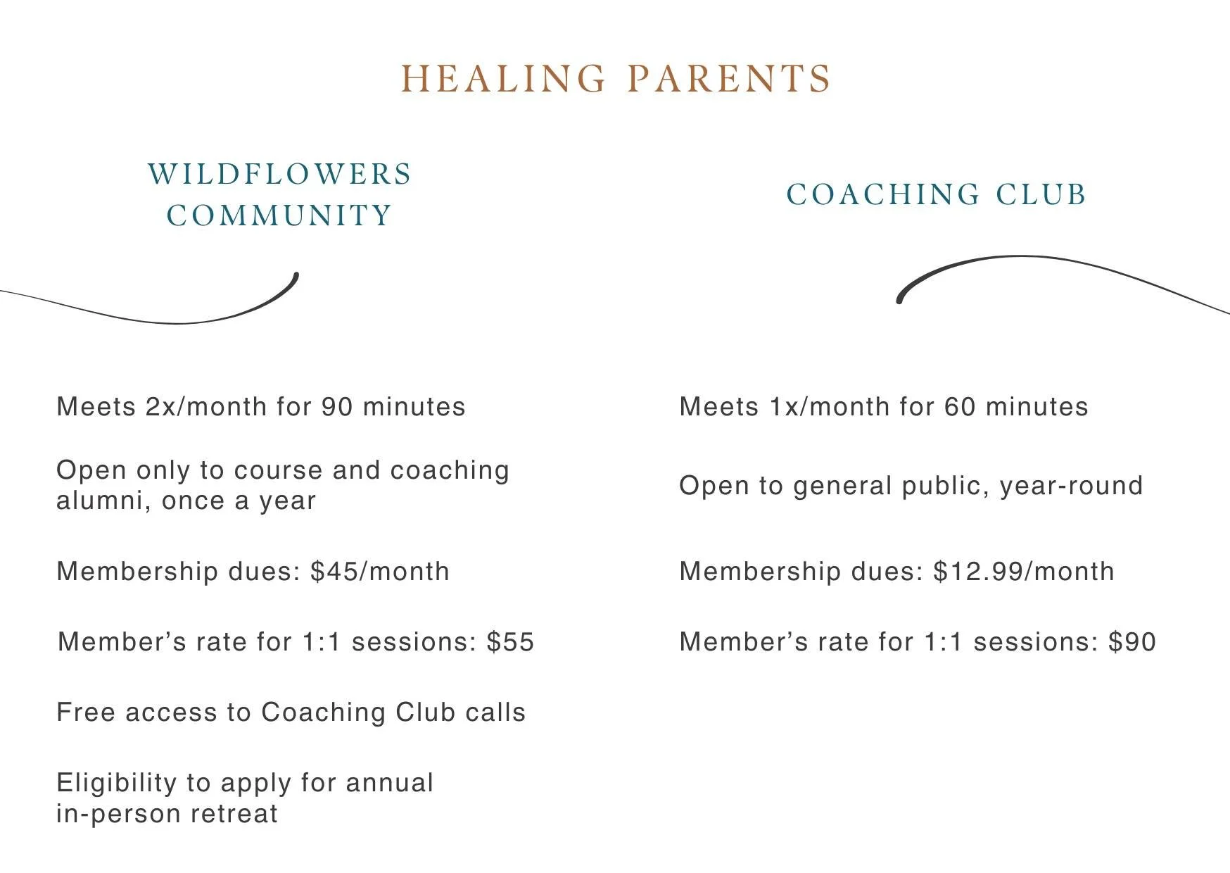 Both the Wildflowers and the Coaching Club communities will provide a warm container for coming together with others who are healing themselves while parenting. However, the Wildflowers Community will provide a smaller, more protected container for parents with a deeper level of commitment to the group–which allows for more profound work to happen. Please see a comparison of the two offerings below: